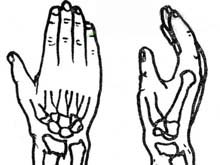 患者腕背伸位跌倒,手掌着地后,感腕部剧痛,不敢活动,肿胀尤以局部肿胀明显,有时可见皮下淤血,手指处于半屈曲休息位,不敢握拳,需要健手托扶患手方能减轻些疼痛。如近侧断端压及正中神经,则有手指麻木等正中神经功能障碍表现。柯力骨折的典型体征如下。