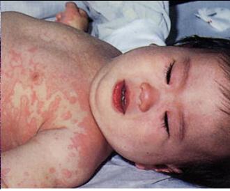 皮疹即使在同一病人也可有许多类型,可同时在四肢出现。皮疹多见于躯干和四肢近侧端,一般无显著特点。最常见的是斑丘疹,猩红热样皮疹和多型性红疹也较多见。腹股沟的皮疹和脱皮时有发生。以上这些均发生于急性期,较指甲端脱皮发生早。