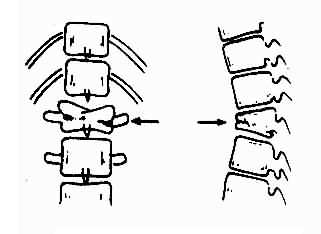 当椎体突然遭受压缩暴力时,由于椎节前柱楔形变而使椎节的中部(柱)及后部(柱)受到牵张应力的作用而呈现分离状,此时三柱均遭破坏。如同时伴有旋转暴力,则椎节出现相应的轴向位移,前纵韧带及后纵韧带多相继断裂,并引起脊髓损伤。本型以胸11~腰2段为多发,因而圆锥及马尾的损伤率特别高(图1A)。