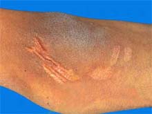 皮肤弹性过度:于皱褶处拈起皮肤尤如橡皮样向外伸展,放手后皮肤恢复原来位置,且可有劈啪声。皮肤柔软,外观像天鹅绒样,摸之如湿羊皮般柔软。