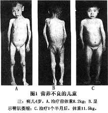 以热能缺乏为主的婴幼儿营养不良称营养不良性消瘦。营养不良性消瘦系由于长期摄食过少引起,突出的是长期能量不足,或食物不能充分利用,以致不能维持正常代谢,只能消耗自己身体组织供给能量,以维持最低的生命代谢所需。出现体重不增或减轻,生长发育停滞,脂肪逐渐消失的一种慢性营养缺乏症。是一种多见于婴儿期的极度消瘦,又称婴儿萎缩症(infantile atrophy,inanition,athrepsia)。肌肉萎缩,精神萎靡,易疲乏。同时全身各系统功能紊乱,免疫力低下,给很多疾病,特别是婴幼儿肺炎和腹泻创造了发病的条件。