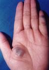 2.血囊为一复盖于薄层皮肤的蓝色橡皮样乳头。