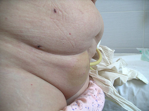 与造口旁疝的大小及是否出现并发症有关。早期无明显临床症状或仅在造口旁出现向外突出的皮下肿块,在长时间站立、行走、咳嗽、用力排便、排尿)时出现,休息或平卧时减小或消失;肿块会渐增大。因疝囊扩张牵扯腹壁和造口,部分病人可出现局部钝痛,坠胀感,饱胀感,消化不良,便秘等不适。巨大疝可影响穿衣和生活。