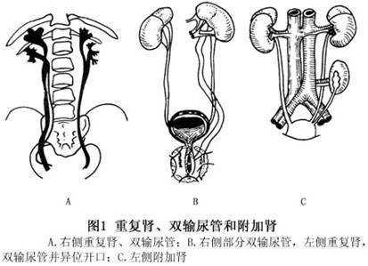 1.不完全性双重输尿管 上、下肾的输尿管呈“Y”形融合成一根输尿管,并开口于膀胱内正常位置,其交汇点可在输尿管的任何部位。