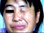 严重损伤者,面肌麻痹显著,甚至见于面部休息时。病人下半部面部肌肉松弛、面纹消失,颈阔肌裂隙较正常宽,面肌和颈阔肌随意和协同运动完全性消失。当病人试图微笑时,下半部面肌拉向对侧,造成伸舌或张口时出现偏斜的假象。唾液和食物聚集在瘫痪侧,病人不能闭眼,随闭眼动作可见眼球向上、并略向内转动。当病变位于周围神经至神经节时,泪腺神经失去作用,不能通过眼睑运动将眼泪压进鼻泪管,导致结合膜囊内眼泪聚集过多。因上眼睑麻痹,角膜反射消失,通过眨动另一侧眼睑才表明存在角膜感觉和角膜反射的传入部分。