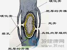 出现死骨,周围有大量炎性肉芽组织和脓液,而新生骨形成包壳。