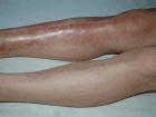 2.带状硬皮病(linear scleroderma) 带状硬皮病多见于儿童和青年。皮肤硬化呈线条状或带状分布,好发于额部,可累及面部和头部,局部皮肤明显萎缩、凹陷,可从正中线偏向一侧的额部向上蔓延到头顶部,而发生带状永久性秃发斑,向下蔓延可达鼻翼及口角,而发生萎缩、凹陷。边界清楚,如剑砍状,最后皮肤菲薄萎缩,似贴于骨面上。损害亦可沿肢体或肋间呈带状分布,为单条或数条不等,形态特征和经过与硬斑病相似,但皮损有明显凹陷,有时皮损下的肌肉、骨骼亦受累,出现骨脱钙、疏松、变细,附近关节可因挛缩而影响功能(图1)。