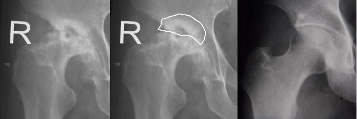 本病应与早期股骨头转移癌、骨肉瘤、骨斑点症、股骨头骨骺滑脱或股骨头骨骺坏死合并严重关节退行性改变鉴别。