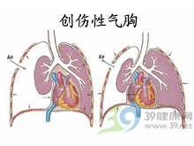 纵隔摆动又可刺激纵隔及肺门神经丛,引起或加重休克(称之为胸膜肺休克)。另外,外界冷空气不断进出胸膜腔,不但刺激胸膜上的神经未稍,还可使大量体温及体液散失,并可带入细菌或异物,增加感染机会。同时伴有胸内脏器伤或大出血,使伤情更为加重。胸壁开放性创口(吸吮伤口)愈大,所引起的呼吸与循环功能紊乱愈严重。当创口大于气管直径时,如不及时封住,常迅速导致死亡。有的胸腔穿透伤,空气虽可在受伤时由外界进入胸膜腔,但随即创口迅速闭合,胸膜腔与外界隔绝,所形成的气胸不能称之为开放性气胸。