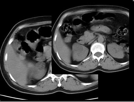 4.腹腔内实质脏器破裂 表现为突发性腹痛、反跳痛及腹肌紧张,因严重出血而导致休克,易与肾错构瘤自发破裂出血相混淆。但出血前已有原发脏器病变,如肝癌等。外伤或剧烈活动常为破裂出血的诱因。无血尿表现,IVU示肾盂肾盏形态正常,超声检查肾脏为正常声像。
