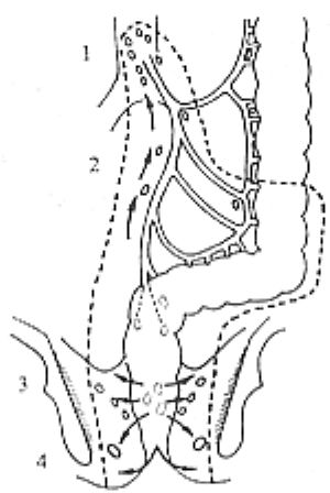 肛提肌levator ani为一对四边形薄扁肌,起于耻骨后面与坐骨棘之间的肛提肌腱弓tendinous arch of levator ani ,纤维行向内下,止于会阴中心腱、直肠壁、尾骨和肛尾韧带,左右联合成漏斗状。