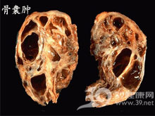 骨囊肿合并病理性骨折时,骨碎片向囊腔内移位;而骨纤维异常增殖症发生病理性骨折时,骨碎片移位不明显,骨痂形成少,易形成骨不连。