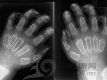 骨骼畸形:表现和I-S型相似,脊椎的鸟嘴突,椎骨扁平,飘带肋骨,脊柱弯曲,胸前后径增大,伴鸡胸和短颈的桶状胸,还可有鸡胸,骨质疏松,髂骨外翻,股骨头变平,腕和膝关节肿大,但无关节强直。其特征性面容为眼距宽、鞍鼻、嘴宽大、牙有间隙和牙釉质发育不良、上颌骨突出。
