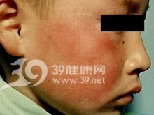 1.传染性红斑 是B19感染最常见的表现,并且主要出现于儿童。这一疾病也被称为第5号病,因为在19世纪后期有人将其分类为儿童的6种发疹性疾病中的第5种。一般情况下,传染性红斑是一种轻微的疾病,典型表现是面部出现皮疹,有一种“被拍击过的面颊”外观,口周苍白;此前可有轻微的发热。皮疹可在手臂和腿部迅速出现,并且通常其外观呈花边样网状红斑。躯干、手掌和足跖较少受累。皮疹偶尔表现为斑丘疹、麻疹样、疱疹样、紫癜样或有瘙痒特征。典型的皮疹在大约1周左右消退,但也可在数周间断出现,特别是在紧张、运动、暴露于阳光、沐浴或环境湿度发生改变时。在儿童,关节痛和关节炎不常见,而在成人常见,但后者皮疹却缺如或为非特异,缺乏特征性面部红斑。