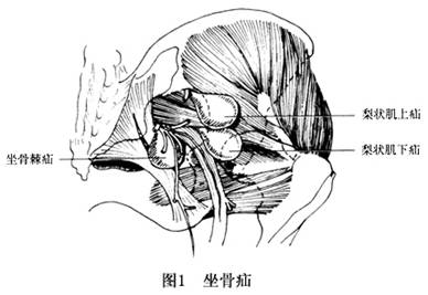 1.分型 根据疝内容物脱出的途径,坐骨疝有3种类型:坐骨大孔的梨状肌上型、梨状肌下型以及通过坐骨小孔的坐骨棘下型(图1)。