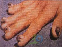 Ⅰ型先天生厚甲症的特征性表现为指(趾)甲显著肥厚,掌跖角化过度、多汗,肘膝臀部出现毛囊角化过度性皮损等。其中甲改变于出生后出现,但更多见于出生后几个月内,因角化过度导致甲远端向上翘起,出现特征性的门槛样远端角化过度。黏膜白斑多见于舌和口腔,偶尔累及喉部。引起声嘶。此外于足跖受压部可见胼胝,行走可导致水疱。手掌胼胝仅见于手工劳动者。
