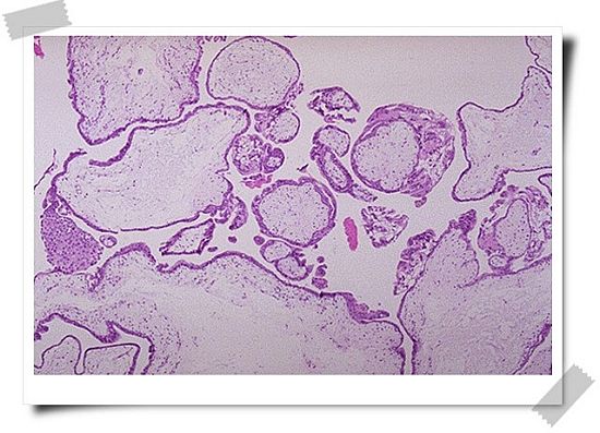 2.绒毛因间质高度水肿而增大;间质内血管消失,或见少量无功能的毛细血管,内无红细胞;滋养层细胞有不同程度增生,增生的细胞包括合体细胞滋养层细胞(syncytiotrophblast)和细胞滋养层细胞(cytotrophoblast),两者以不同比例混合存在,并有轻度异型性。滋养层细胞增生为葡萄胎的最重要特征。正常绒毛在妊娠3个月后,滋养层细胞仅剩合体滋养层细胞,而葡萄胎时这两种细胞皆持续存在,并活跃增生,失去正常排列,呈多层或成片聚集。