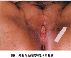 3.外阴白斑(leukoderma) 一般无瘙痒症状,可发生在外阴皮肤或黏膜上,局部表现为边界清楚的片状,发白、患处毛发也为白色,而外阴皮肤纹理,形状和光泽无变化、弹性好,周围可有色素沉着(图5,6)。