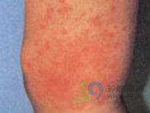 皮肤损害初期为鲜红或紫红色皮下深在局限的结节,单发或多发,圆形或椭圆形,小者可如黄豆大,大者可如鸡蛋大,散在分布。以后可融合成斑块,界限清楚,有时边缘稍高起,压之无凹陷,多无自觉症状,亦无全身症状。约于满月前后,结节及斑块开始软化吸收,数月后完全消退,过程中一般不破溃。常见于足月分娩的健康婴儿,在1~6周内发病。多见于臀部、大腿部及面颊、躯干等处,有时上肢、外阴亦可被累及。