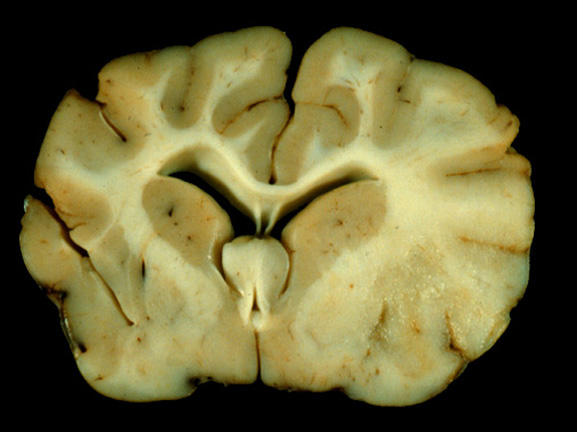 脑组织肉眼检查可见受损的脑膜和脑实质有弥漫性或局灶性病变,脑组织水肿。脑回增宽、脑沟变窄。在局限性病变的相应部位有脑白质水肿,严重时可见坏死,坏死组织呈蜂窝状,有时周围有点状出血。