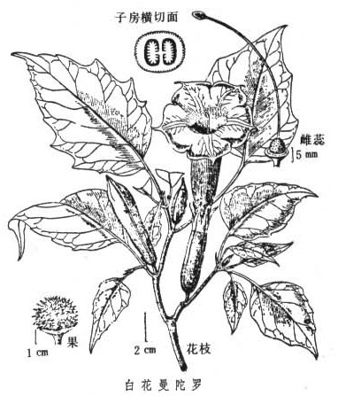 曼陀罗(datura stramonium)又称洋金花,种类很多,各地称呼也不一致,为一年生的草本,我国各地都有生长,大多是野生。全株有毒,主要成分是莨菪碱、阿托品及东莨菪碱等生物碱。各种之间所含毒性成分及量各不相同,根、茎、叶、花、果实含毒量也不等,以种子含毒量最高。小儿内服3~8个种子即可发生曼陀罗中毒。毒性作用是对中枢神经先兴奋、后抑制,阻断乙酰胆碱反应。同科植物莨菪(hyoscyamus),其叶、根、花、种子均有毒。在新疆、内蒙等地较为普遍。儿童误以其根茎为\"野萝卜\",采食中毒。其所含生物碱,主要为莨菪碱,中毒症状与采食曼陀罗者相似。