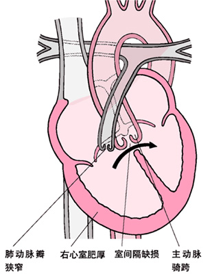 (2)主动脉异常粗大右移:骑跨于室间隔之上,可同时接受左右心室的血流。主动脉骑跨与室间隔缺损的位置有关,但不论主动脉右移程度如何显著,主动脉瓣与二尖瓣前叶仍有解剖连续。