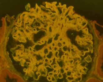 肾活检观察到的变化类似于任何急进性肾小球肾炎,包括上皮细胞新月体形成,肾小球粘连和间质炎性渗出,肺泡内出血,充满含铁血黄素的巨噬细胞和肺间隔纤维化。免疫荧光染色显示在肾小球基膜和一些病人的肺泡-毛细血管基膜内有免疫球蛋白和补体沉积。