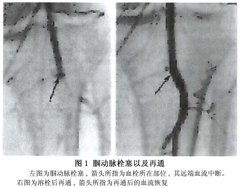 (4)经皮腔内血管成形术(PTA):PTA治疗对于动脉局部病变引起的急性动脉闭塞效果良好。单纯PTA的缺点是复发率高。随着血管支架的使用,复发率明显减少。对大血管的治疗效果比小血管好。PTA治疗后要继续抗凝治疗(图2)。