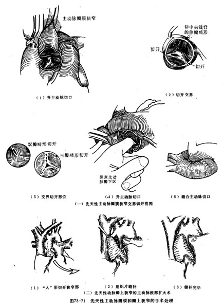 1.先天性主动脉瓣膜部狭窄 外科治疗的目的是分离融合的瓣叶交界,扩大瓣口,解除对左心室排血造成的梗阻性病变而不引致瓣膜关闭不全。或切除损害严重的病变瓣膜,作人工主动脉瓣膜替换术。