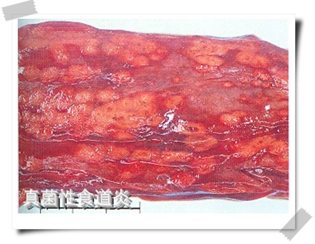 正常口腔中的念珠菌是与之竞争的细菌控制之下,只有在宿主的抵抗力被削弱或用抗生素杀灭了细菌,才使真菌侵入食管上皮产生坏死的、烂皮样的假膜。假膜中含有纤维蛋白、坏死组织的碎屑和念珠菌的菌丝体。假膜脱落,黏膜面充血、溃疡。总之,溃疡和假膜是特征性所见。