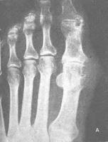 关节炎最常见于膝、踝、掌、指及?趾等关节,其次为肩、肘、腕、髋及脚等关节,20%为单关节,50%为非对称性。患病关节突然关节疼痛,常很严重,早晨有强硬感。关节炎的急性期,关节可有发热、红、肿胀及疼痛。病程各不相同,一般在恶性病控制后缓解,完全或部分缓解,或慢性过程中,可以有急性发作,一直形成严重的功能丧失。