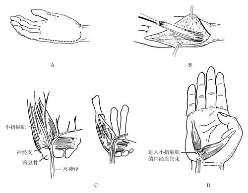 2.神经缺损小于2cm时,可通过屈曲腕关节和游离近远端神经干来克服,但最大屈曲角度以20°为宜,而游离范围以2~3cm为佳。游离过多会影响神经断端血运。神经缺损大于4cm时应作神经移植,如无把握时,可放松止血带,见断端血运恢复缓慢则应作神经移植。