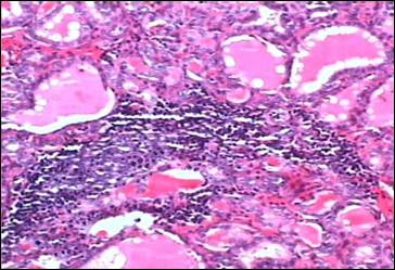 2.病理 甲状腺呈结节性肿大(一个或多个),包膜完整或无包膜,镜下可见结节内滤泡上皮增生,有乳头形成,滤泡内胶质液少而稀薄(这与单纯性结节性甲状腺肿之区别)。结节亦可呈腺瘤样改变,结节内可有出血、钙化等。结节周围的甲状腺组织呈萎缩并有受挤压现象。