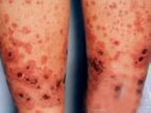 皮疹表现有全身性红色丘疹、出血性丘疹、血管性水肿、风团性斑块、黏膜炎、牙龈炎、全秃等。偶有环状红斑、水肿性损害及水疱。主觉痒。无全身症状,病程长,呈慢性复发过程(图2)。