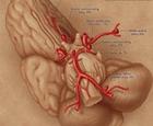 在GCA,血管炎最常见于主动脉弓分支血管,但偶尔也可累及全身任何动脉以及一些静脉。受累血管常呈节段性分布或片状分布,也可累及较长血管。取自GCA活动期的血管标本显示,严重受累的血管多见于颞浅动脉、椎动脉以及眼动脉和睫后动脉,其次为颅内动脉、颅外动脉以及视网膜中央动脉。另有尸检资料显示,主动脉近端以及远端、颈内及颈外动脉、锁骨下动脉、肱动脉以及腹部动脉受累亦较常见,但颅内动脉受累少见。在一些病例,即使症状已经缓解,动脉活检仍有持续性的、弱的慢性炎症存在。在大体病理上,GCA容易形成主动脉的动脉瘤、夹层和狭窄,主动脉的主要分支亦容易形成狭窄。有关继发于GCA的冠状动脉和主动脉弓的各种病变的个案并不少见。和胸主动脉一样,腹主动脉也可受累,出现动脉瘤以及相关的症状,可出现肠梗死。GCA还可以影响上肢和下肢的主要供血血管,出现间歇性跛行。在GCA累及大血管时,损害难以与大动脉炎相区别。