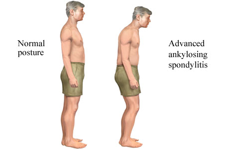 强直性脊柱炎晚期,由于炎症已基本消失,所以关节无疼痛,而以脊柱固定和强直为主要表现。颈椎固定性前倾,脊柱后凸,胸廓常固定在呼气状态,腰椎生理弯曲丧失,髋关节和膝关节严重屈曲挛缩,站立时双目凝视地面,身体重心前移。个别病人可严重致残,长期卧床,生活不能自理。