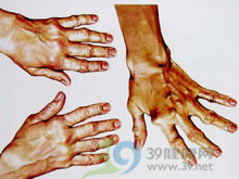 1.初发症状 起病方式可隐匿,也可急骤。3/4为隐匿起病,病人先有疲劳、倦怠感,体力下降,食欲不振,低热,手足麻木,雷诺现象等。急性发病者可有发热,有时可为高热。初发症状可先于关节症状数周或数月。