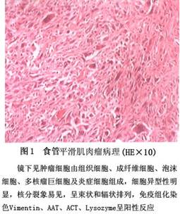 7.食管恶性神经鞘瘤 神经鞘瘤好发于四肢、躯干及头颈部。肉眼所见可与神经干密切附着,原发于食管者罕见,恶变者更少。神经鞘瘤是起源于神经膜细胞鞘的良性肿瘤,恶变机会较少,原因不明。食管具有较丰富的神经末梢纤维,故也可发生本病。文献中仅见有食管恶性神经鞘瘤的个案报道。发病年龄多在中年以上。肿瘤沿神经末梢径路生长,形成瘤体,据瘤体的大小而出现相应的临床症状。临床多以出现吞咽困难来就诊。治疗以手术为主,术前不易诊断,均靠病理确诊。
