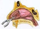 首先应用大量广谱抗生素控制感染,可用甘露醇降低颅内压力,然后做耳内或耳后切口,将鼓室乳突腔内残留病灶如死骨、胆脂瘤、肉芽等清除干净,然后将疝出脑膜脑组织切除,不能还纳颅内,否则坏死变性的脑组织形成脓肿,将加深感染。随后取阔筋膜或颞筋膜缝合修补脑膜缺损处。另取带蒂颞肌瓣或胸锁乳突肌瓣填塞术腔。如颅骨缺损较大,可采用自体肌片或肋软骨片移植。该修补术必须在感染彻底控制之后才可进行。