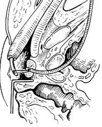 2.H形尿道直肠瘘 先行结肠造瘘及耻骨上膀胱造瘘,二期经会阴切除瘘管,分别行后尿道及直肠修补。
