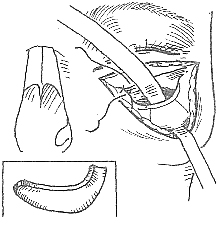 手术方法:在下睑睫毛下方作一横切口,切开皮肤和眼轮匝肌,勿切开眶隔,沿眶的表面向下分离,至眶缘,在眶缘的下方,横行切开骨膜,沿骨面剥离眶底的骨膜,显露眶底骨折处。注意保护眶下神经。细心、充分地进行分离,将下直肌、眶内脓性物从嵌顿处解脱出来,使之纳回眶内。用牵拉试验进行检查,直至眼球运动不受限。有眶下缘骨折者应予复位,作骨间结扎固定。眶底有骨质缺损者,可植入骨片或代用品,以重建眶底。