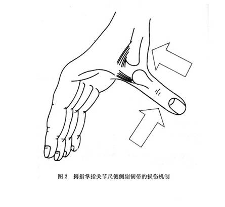 拇指掌指关节尺侧侧副韧带损伤可由拇指于用力外展、旋转和过伸所致。在滑雪损伤时,多由不正确的握雪杆滑行所致;打球时,尤其是在接球时,可能为球的直接创伤所致;使用手杖也可致慢性损伤。在手着地跌倒时,处于外展位的拇指使尺侧侧副韧带过度负重,而滑雪杆柄在拇指和食指之间更加重了这种负重(图2)。韧带损伤的程度主要取决于作用力的方向、作用力作用瞬间拇指所处的位置和关节所受的压力。