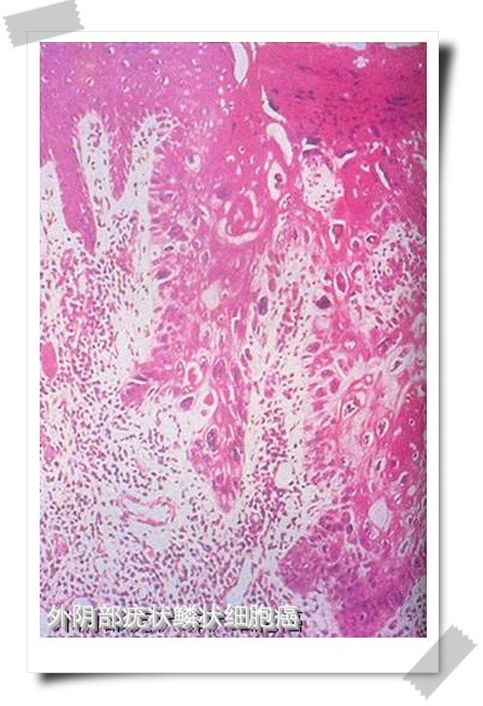 此型癌表面呈乳头状。乳头有中心柱间质、癌细胞浸润处形成许多不规则细胞巢。在癌细胞邻近可找到外阴表皮内瘤样病变。HPV、DNA检测阳性率高,