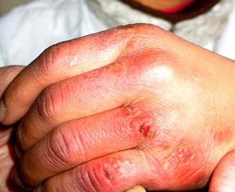 二度:为皮肤全层冻伤。除红肿外,出现水疱,疱破后易感染。如无感染,经2~3周后水流干枯成痂。