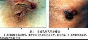 非哺乳期乳晕区感染乃至形成瘘管的机理尚不一致。Patey推断与主乳管先天性畸形有关,还有人认为是大乳管的局部感染向外破溃而成,也有人认为系皮肤感染蚀破乳管所致。有作者认为瘘管外口均在乳晕区附近,是因乳晕区皮肤有丰富的皮脂腺、汗腺及多个乳晕腺(一般为5~10个),分泌旺盛,若输乳导管远端(即乳晕部)闭锁再加上局部皮肤的感染而致的引流物不能排出即可发展为本病。
