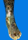 2.静脉曲张性溃疡 患肢由于静脉曲张,血流淤滞,周围组织水肿,小动脉和淋巴管阻塞,加之外伤或感染,常在小腿胫前部和内踝上方形成静脉曲张性溃疡。损害为少数孤立,圆形或不整形钱币大小的溃疡,边缘整齐或不规则,肉芽生长缓慢,苍白,表面有脂肪样或纤维样苔状覆盖物及浆液性分泌物,有时表面形成坏死。周围皮肤坚硬紧张。可逐渐扩延到踝部或上达膝部。自觉微痛和瘙痒。如边缘发生神经瘤时,则感阵发性剧痛。晚期常合并有血栓性静脉炎。