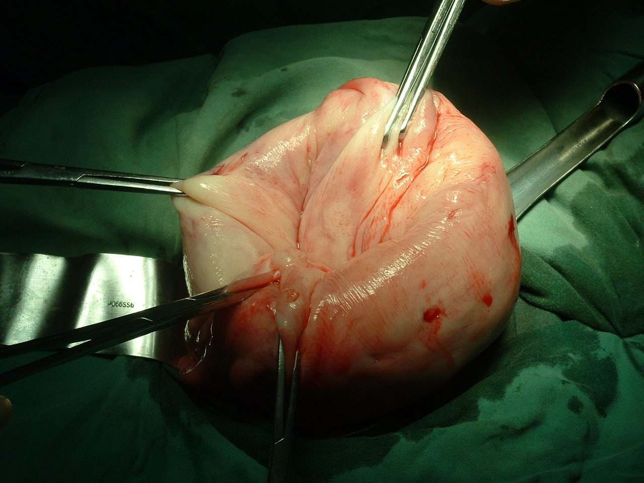 3.子宫底部肌壁薄弱和(或)宫底部接受不恰当的压力或拉力是启动子宫内翻的机制,但部分子宫内翻后,子宫壁的收缩甚至痉挛性收缩是加重和维持导致子宫内翻的机制。将子宫看成弹力很好的半个篮球,施加一定压力,球壁下陷,去掉外力,自然弹回,恢复原来形状;当压力过大则不能弹回,形成局部凹陷,甚至自行完全迅速翻转,原来内面翻转成外面,外面翻转成内面。子宫内翻后,宫底部呈杯口状,肌肉痉挛,限制翻出肌壁的自然恢复。另外,翻出之肌壁达到宫腔,对子宫腔是一种占位或负荷或刺激,可以刺激子宫进一步收缩产生向下的力,加重翻出之肌壁向子宫颈和阴道移动。