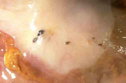 二、间质性子宫内膜异位症 为内在性子宫内膜异位症的一种特殊类型,较少见,即异位的内膜仅有内膜间质组织,或子宫内膜侵入肌层后间质组织发展的范围及程度远远超过腺体成分(照片3)。一般子宫一致性增大,异位细胞散布于肌层或集中在某一区域,色黄,常具有弹性橡皮样硬度,较肌瘤软,在切面往往可以看到索状小虫样突起,就可据以确立诊断。异位组织亦可向宫腔发展形成息肉状肿块,多发性,表面光滑,蒂宽与子宫肌壁有较大面积的直接连系,并可由宫壁向宫腔或沿子宫血管向阔韧带内突出。向宫腔突出者致成月经过多甚或绝经后流血;向阔韧带突出者可经妇科双合诊查出。间质性子宫内膜异位症可有肺播散,甚至在切除子宫数年后还能发生。由于这种特点,有人认为间质性子宫内膜异位症是低底恶性的肉瘤。