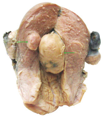 (1)子宫较大,肌层增厚,有多发结节状橡皮样肿物。