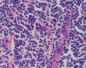 镜检低度恶性子宫内膜间质肉瘤细胞类似于正常增生期子宫内膜间质细胞,其间满布类似分泌晚期螺旋动脉的厚壁小血管。细胞为圆形、大小一致的,胞浆少,核深染,核分裂象<3/10HPF,肿瘤细胞侵入淋巴管或血管内形成蚯蚓样瘤栓。高度恶性者细胞异型性明显,核分裂象≥10/10HPF。